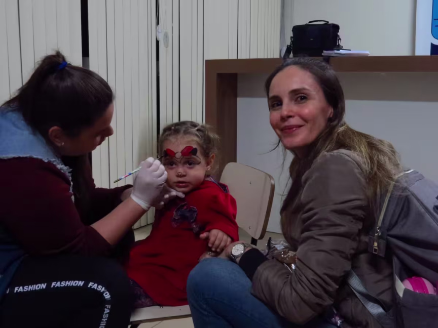 Na área de pintura, estava Valentina Javaroni Veiga, de dois anos, que fazia uma obra de arte no rosto. A mãe, a técnica judiciária Sara Javaroni Veiga, 38, conta que a filha faz acompanhamento na Uni Duni Tê de seis em seis meses e avalia como importante a interação entre a filha com os alunos da associação.