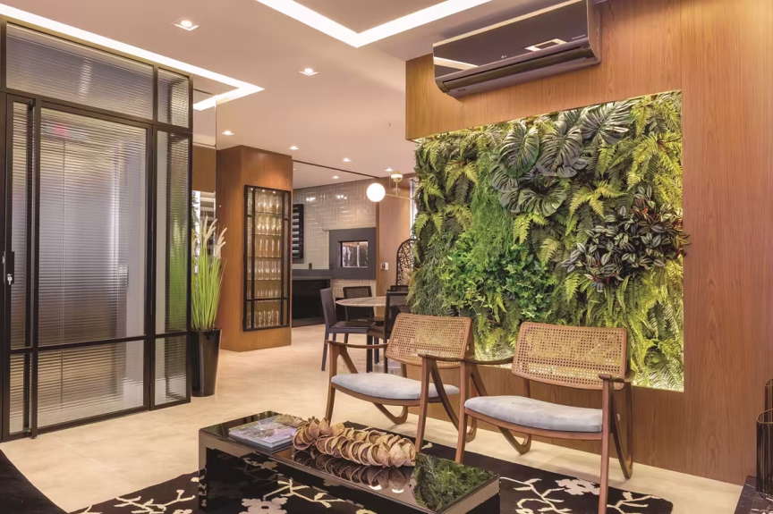 O elevador social saía diretamente no apartamento. A pedido do casal, foi criado um hall de entrada singelo, que recebe fechamento com estrutura de metal na cor preta, vidro canelado e uma grande porta com puxador de 2,20m. Logo na entrada, o living com o estar social recebe jardim vertical, poltronas, sofá e lareiraNa área de jantar, mesa oval com tampo de mármore e base Saarinen complementa o estilo contemporâneo e ousado. Os acabamentos de cor preta, fazem destacar a luminária dourada, uma peça de formas singulares que muito além de iluminar, decoram esta parte da área social. Painéis de lâmina de madeira natural recebem iluminação indireta e emolduram a persiana e o jardim vertical ao lado. No fundo, pode-se observar a lareira ecológica, toda em mármore nero marquina