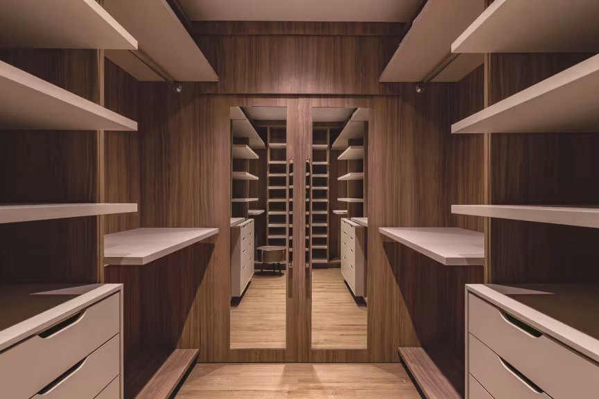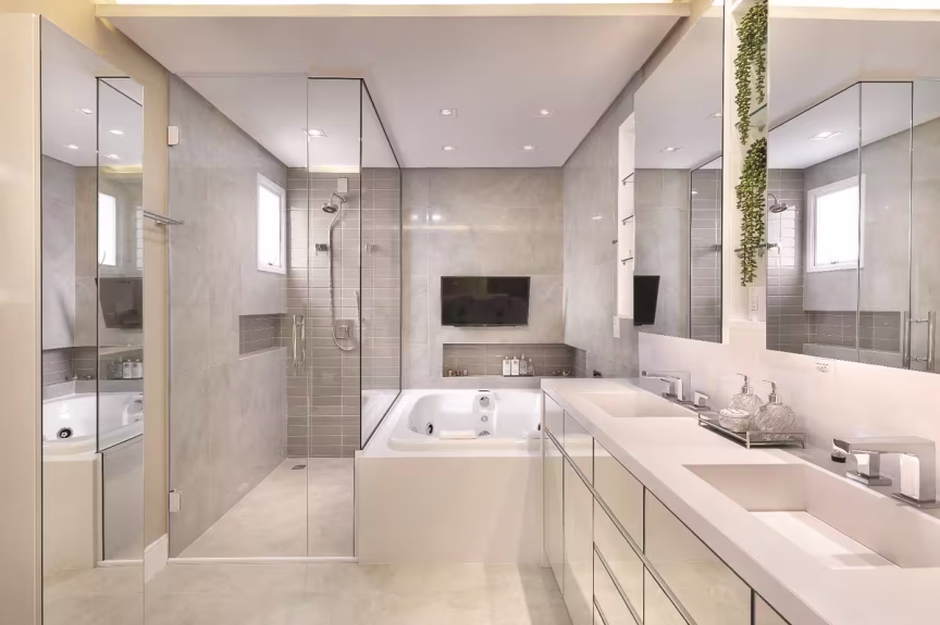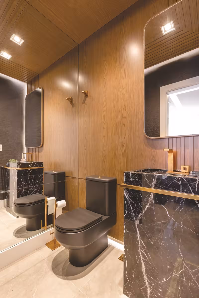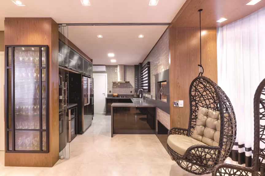 Ousada, a cozinha acompanha todos os elementos que compõem a área social. Todo o mobiliário recebe pintura de laca alto brilho na cor preta e lâmina de madeira. A sofisticação continua com a pedra Silestone Charcoal Soapstone, que reveste toda a bancada, churrasqueira e o nicho do bar (à esq.), que possui adega e frigobar. Nas paredes, aplicação de revestimento com paginação tipo escama de peixe. Portas de correr de vidro podem isolar a área de cozinha/churrasqueira sem perder a integração com os ambientes. O Must fica por conta das duas poltronas de balanço feitas de fibra e alumínio. Elas foram alocadas em uma das sacadas com vista para a cidadeO lavabo social é um charme à parte. Grandes painéis de lâmina de madeira cobrem uma parede e o teto. Cria-se, então, um desenho contínuo de suaves ripas e iluminação indireta. A cuba esculpida em mármore nero marquina, metais com acabamento dourado e papel de parede de croco na cor preta expressa todo o estilo, elegância e contemporaneidade empregada neste projetoO home theater ganha um grande painel para TV e nichos para decorações. Ripas em ângulo, espelhos e pequenos pontos de luz dão leveza à esta área de TV que fica parte em balanço. No canto direito, um nicho central com acabamento de laca dá origem ao altar para a imagem sacra da cliente. Os demais nichos compõe geometria interessante que foi pensada para receber objetos decorativosA suíte master é um verdadeiro refúgio para o relaxamento. Todo em lâmina de madeira natural e laca alto brilho, este ambiente recebeu painéis na cabeceira onde há aplicação de ripas, que criam uma volumetria suave e moderna. O piso vinílico e o luminotécnico complementam o aconchego e criam um clima mais intimista. O conforto também se faz presente na tapeçaria de kilim, cortinas e cama com revestimento de couro, texturas que se mesclam e compõem com elegância toda esta suítePara a bancada de maquiagem, muito espaço e praticidade para a cliente. Nichos, e uma gaveta com divisórias para que tudo fique organizado. A iluminação frontal é essencial nesses casos, e aqui ela foi feita com perfil linear. O pufe recebe aplicação do mesmo couro utilizado na camaNo closet não há portas no seu interior. As prateleiras fazem alusão de serem “flutuantes” e ficam mais expostas. O resultado é maior acessibilidade e visualização das roupas, além de deixar este ambiente bem mais leve. Espaço para ele e para ela, com cabideiros, gavetas e uma sapateira central. O pufe para auxiliar na troca de roupas e calçados e as duas portas com espelhos completam as necessidades deste closetCom boa metragem, a sala de banho do casal ganha espaços bem setorizados. A bancada é toda de Silestone White Storm e recebe duas cubas esculpidas. O mesmo material foi aplicado para dar acabamento na banheira dupla, que a pedido dos clientes ganhou Smart TV e cromoterapia. As nuances de cinza se equilibram com o branco utilizado na marmoraria e na marcenaria que é toda em laca alto brilho branca. Os espelhos na frente dos armários e bancada remetem ao estilo clean e limpo deste espaço