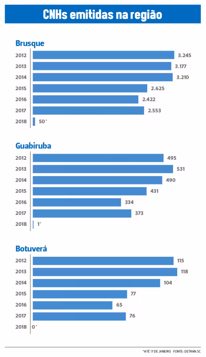 O panorama também é percebido nos municípios vizinhos. Há dois anos, Guabiruba tem menos de 400 novas CNHs anuais. Nela, a reação foi mais modesta e 2017 fechou com 39 registros a mais por parte do Detran em comparação com o ano anterior. Desde janeiro, o município teve uma carteira nova contabilizada.