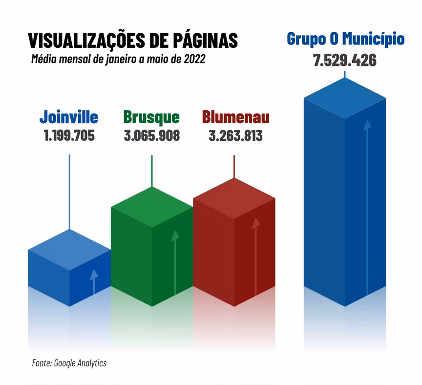 O Grupo O Município tem expandido sua audiência nos portais e nas redes sociais. De janeiro a maio deste ano, somados, têm uma média de 7,5 milhões de visualizações ao mês, de acordo com o Google Analytics.