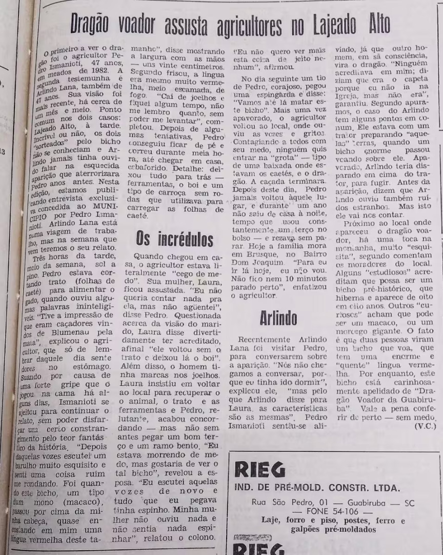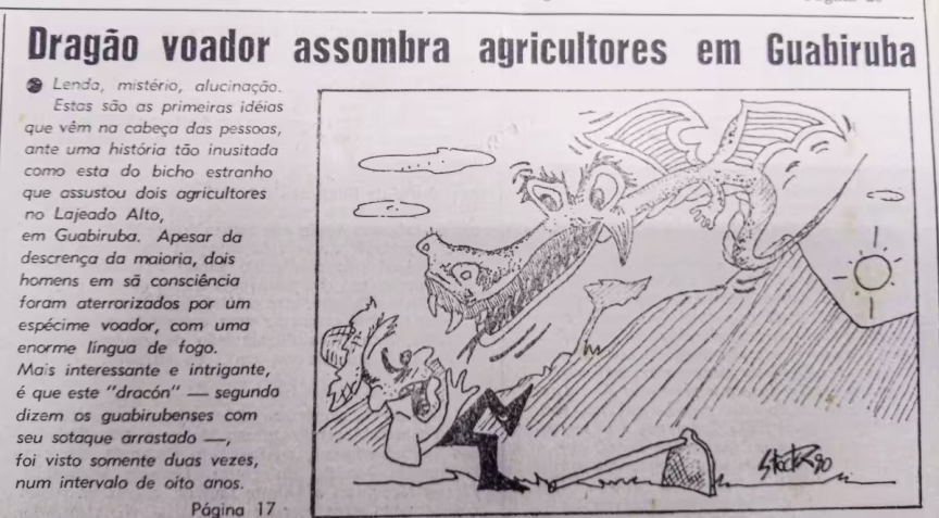 Ela tratava de uma das mais famosas lendas da região: o dragão voador de Guabiruba, cuja primeira e suposta aparição se deu em meados de 1982.