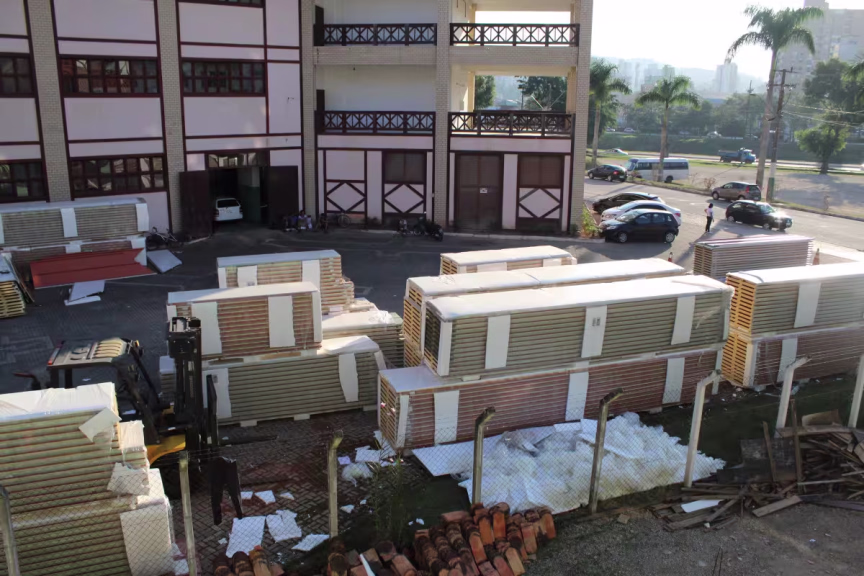 O processo de pintura das paredes será iniciado após a finalização da instalação das telhas e da lavação de todo o espaço do pavilhão. A limpeza começa nesta segunda-feira e será feita com hidrojatos. Depois da higienização e da limpeza, serão feitos os reparos necessários na estrutura, que possui partes danificadas devido ao tempo e às intempéries.