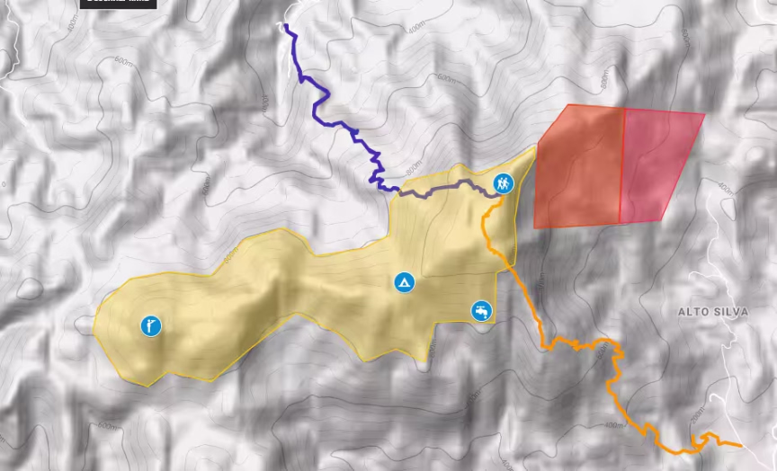Ele diz que uma trilha que passa por essas RPPNs, mas que o trabalho de manejo não será realizado nessa região por não ter acordo com o proprietário. No mapa, as áreas em vermelho são as RPPNs. A parte amarela é onde o manejo será realizado. A linha azul mostra o acesso por Botuverá e a laranja por Nova Trento.