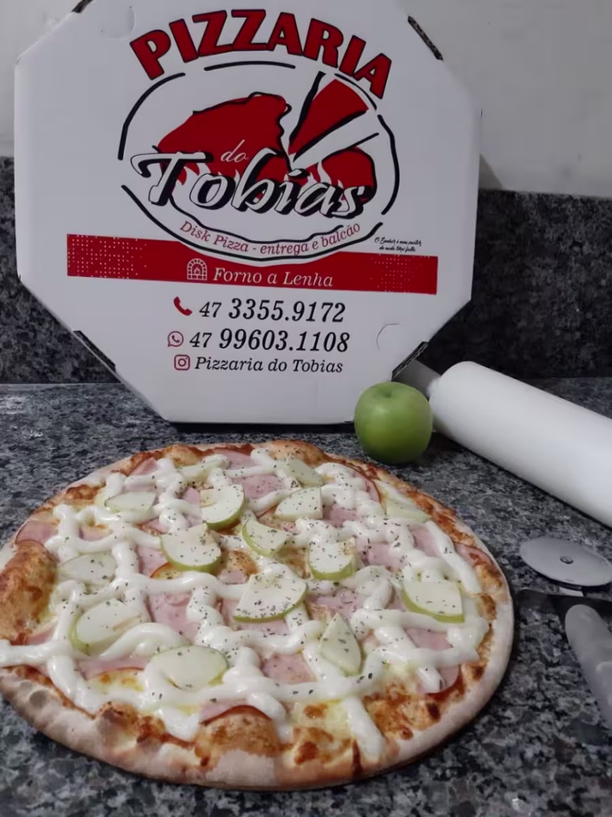 O destaque da Pizzaria do Tobias é a Pizza do Fritz. É feita com molho mussarela, linguiça blumenau moída, alecrim e cebola em rodelas. A pizza é grande, com 12 fatias, 35 centímetros. Acompanha Coca-Cola ou guaraná 1,5 litros!
