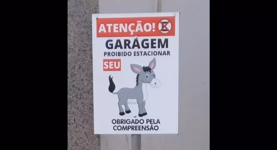 Para reprimir a ação dos motoristas, uma placa que alerta que há um garagem no local foi colocada. Porém, a sinalização é um pouco diferente do convencional. Além das informações alertando que é uma garagem, a placa traz a imagem de um burro logo após a frase “Proibido estacionar seu”.