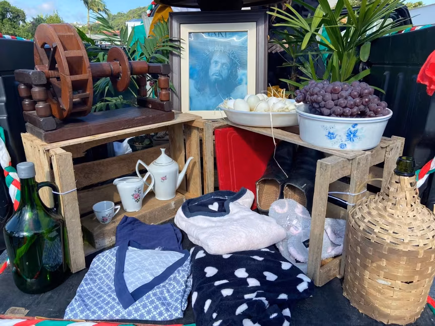 Os descendentes de Humberto e Inês Bosio vieram de Nova Trento para participar da Sfilata del Vino. No carro da família, a polenta e o queijo, pratos que não podem faltar no dia a dia da família e também um quadro antigo de Jesus, representando a religiosidade dos Bosio.