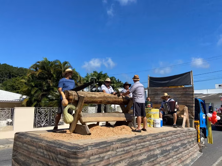 "Somos descendentes da cultura italiana trentina. Trouxemos aqui a tora e a serra utilizada antigamente para lembrar da época do nono. Ele também tocava gaita e reunia a família e amigos em casa para os bailes, por isso também temos o gaiteiro", conta Amilton.