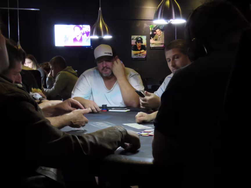Pessoas jogam sem dinheiro na mesa, em ambiente que foge do senso comum sobre a modalidade