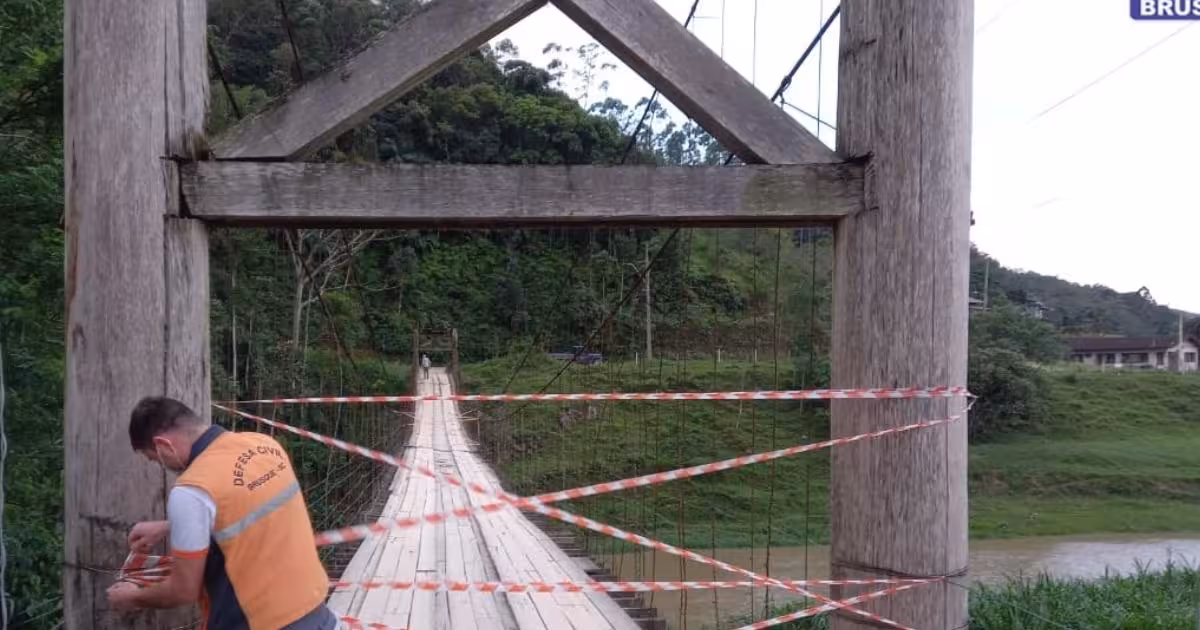 Por cabo solto, Defesa Civil interdita ponte que faz ligação entre Brusque e Guabiruba
