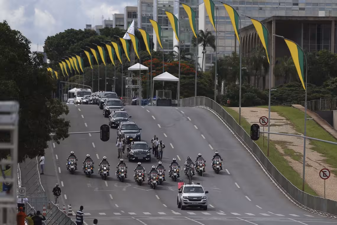 Os Dragões da Independência, policiais em carros, motocicletas e a pé os acompanham em direção ao Congresso Nacional. Pelo cronograma, o desfile do cortejo presidencial da Catedral até o Congresso ocorrerá às 14h45, com previsão de início da sessão solene de posse no Plenário da Câmara dos Deputados às 15h.
