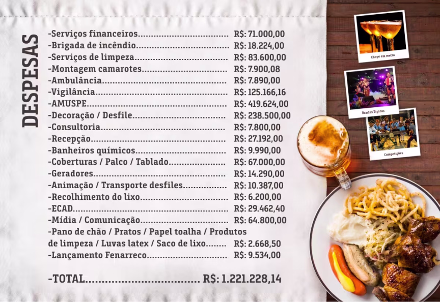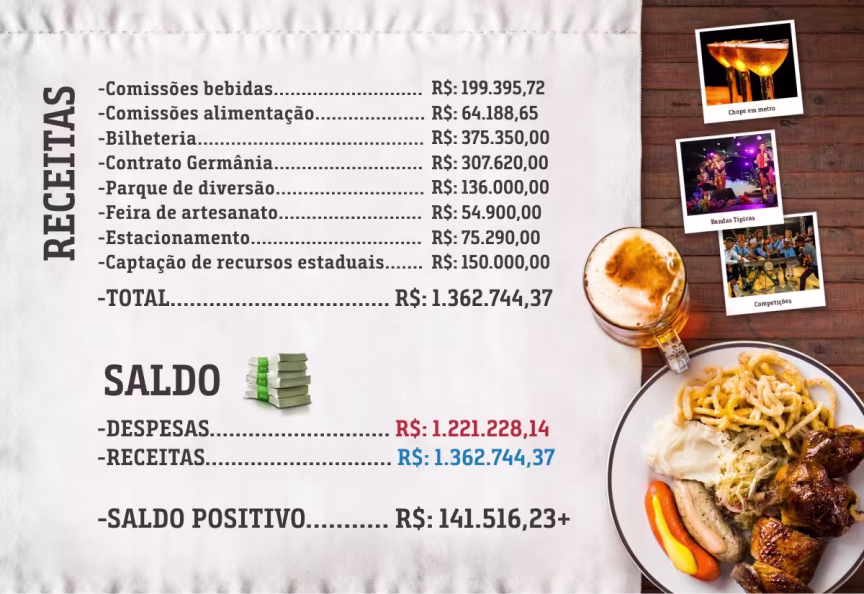 O contrato com a Germânia, marca oficial da bebida da Fenarreco, no valor de R$ 307 mil também foi uma fonte grande de receita.