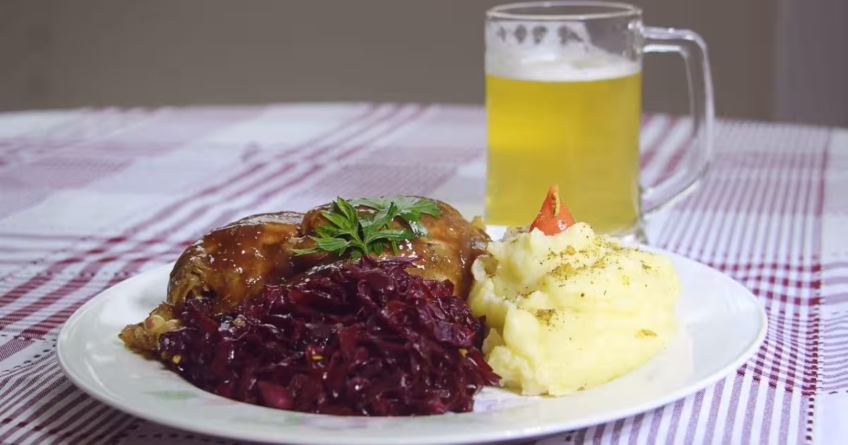 Marreco ao molho, purê de batata, repolho roxo, maçã caramelizada e chucrute.
