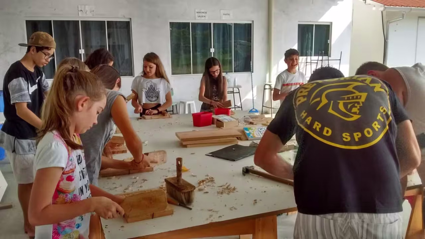 Durante as duas horas de atividades, os participantes – crianças e adolescentes de todas as idades – manipulam ferramentas de verdade. "Não usamos versões de brinquedo. A ideia é dar a elas algo verdadeiro, promover esse contato com os materiais. Assim eles podem sentir o peso, se adaptar à forma de trabalhar." A partir dos seis anos, a criança já começa a aprender o entalhe. Se é mais nova, Sérgio proporciona outras atividades artísticas, como desenhos e lápis para colorir.