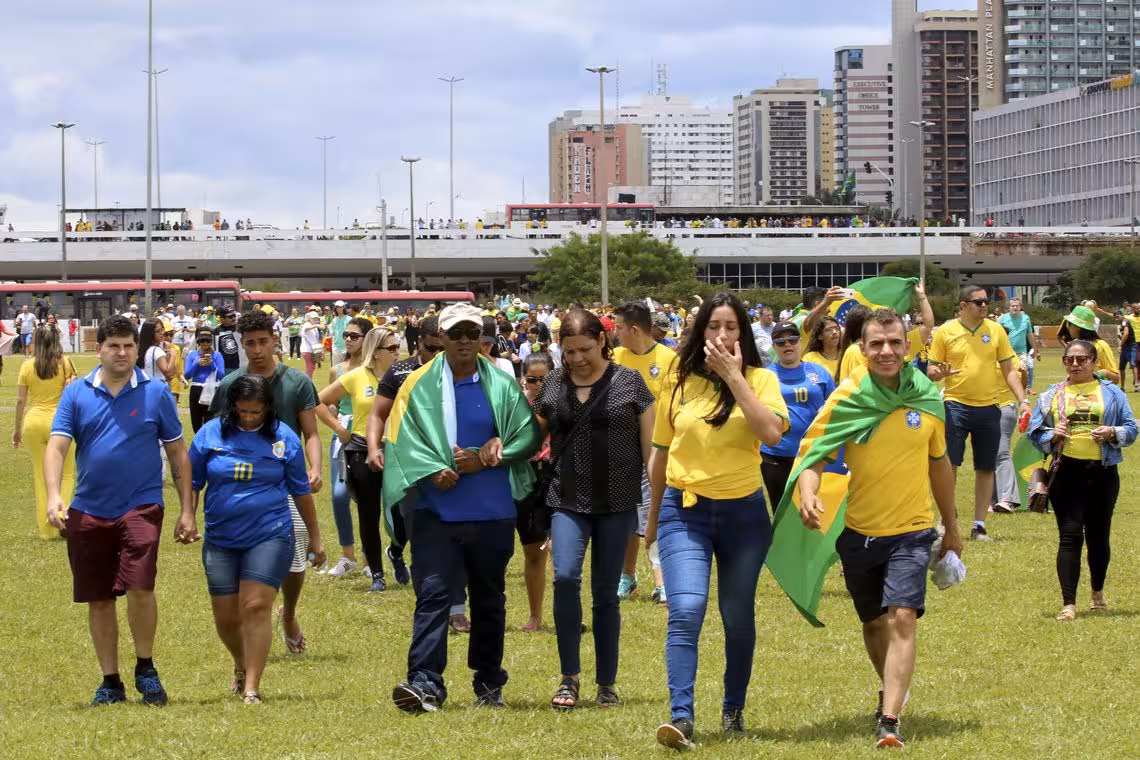 Quando a Polícia Militar ampliou a área de revista, as pessoas que aguardam nas filas correram e gritaram em coro “mito, mito, mito”. Entre camisetas e chapéus nas cores da Bandeira do Brasil, faixas presidenciais estilizadas e bonecos infláveis de Bolsonaro se destacavam.