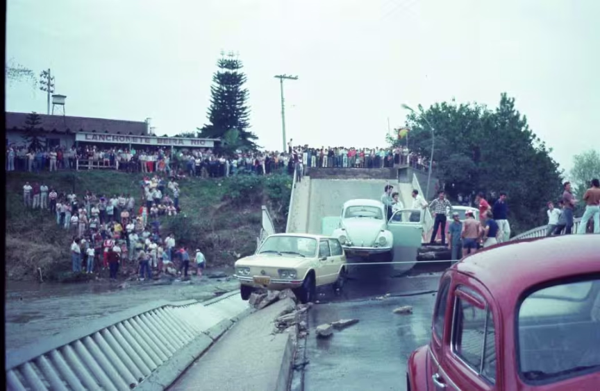 “Um dia, já tinham tirado os carros fora e eles queria implodir a ponte para tirar os pedaços. Eu peguei meu DKV, subi o morro, e deixei meu carro do lado da delegacia, por causa da explosão que ia ter. Quando explodiu, uma pedra veio e quebrou o vidro do meu carro, que é difícil acontecer isso, né. E eram 350 metros de distância. Não dá para acreditar”, brinca.