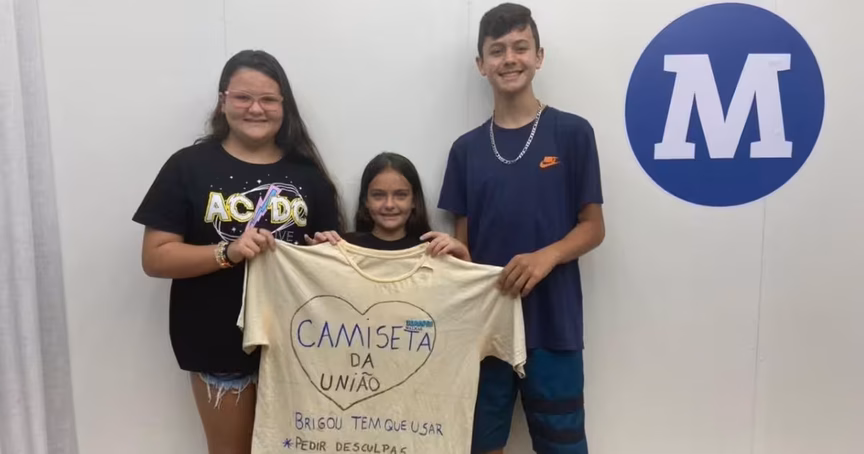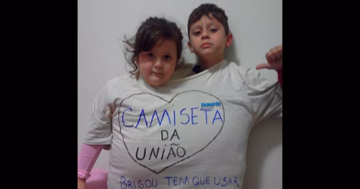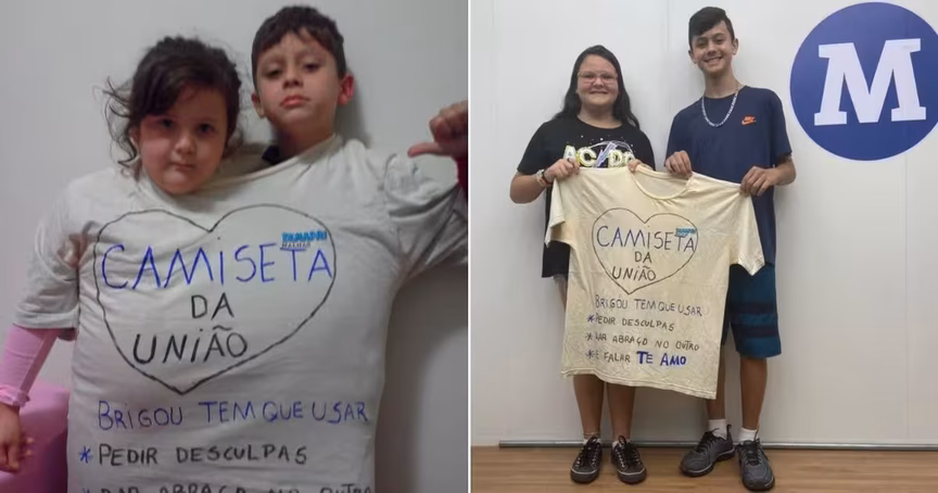 “Ela resolveu fazer essa camiseta, colocamos os dois ali e eles ficavam até se resolverem”, comenta o pai. A intenção dos pais deu certo, pois além de usarem poucas vezes a camiseta, os pequenos entenderam a importância do diálogo e da união entre irmãos.