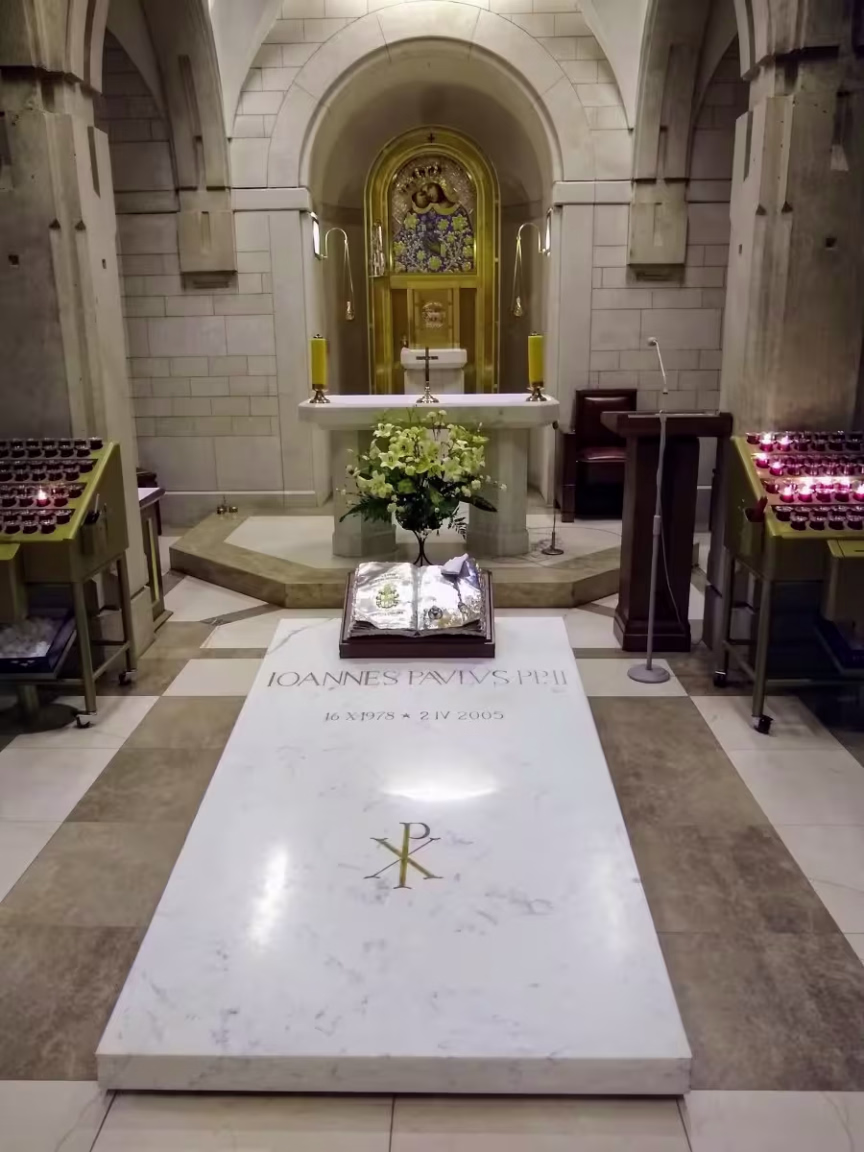 Em uma delas, encontra-se a pedra que cobria o primeiro túmulo onde São João Paulo II foi sepultado. Entre as relíquias, destaca-se uma ampola com o sangue do Santo Papa colocada em um altar de mármore. O Santuário foi construído no mesmo terreno onde funcionava uma fábrica onde Karol Wojtyla trabalhou durante a Segunda Guerra Mundial.