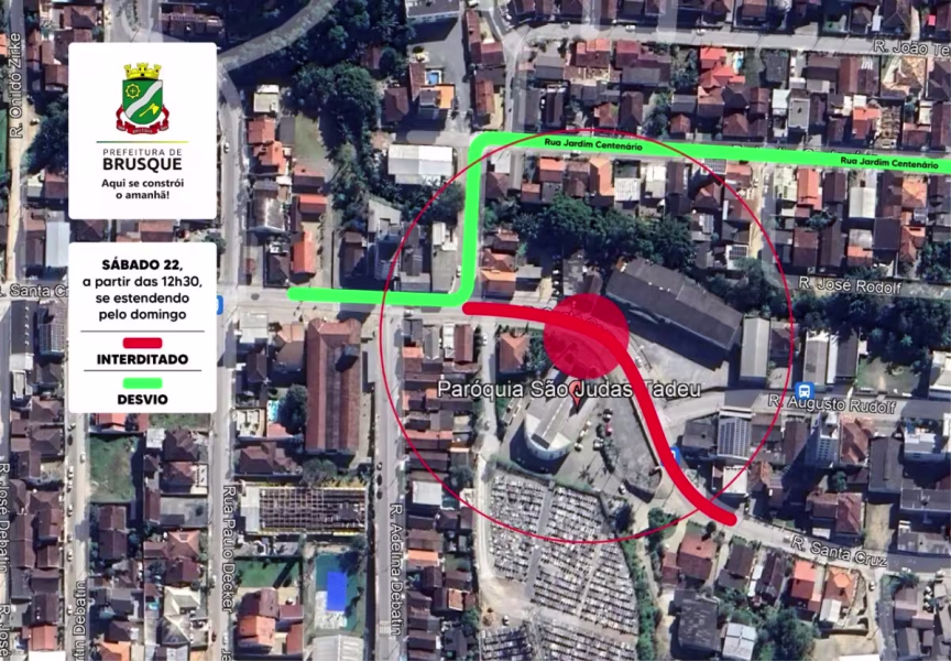 A Prefeitura de Brusque, por meio da Diretoria de Trânsito, comunica aos condutores, que neste final de semana, a rua Santa Cruz, no bairro Águas Claras, nas proximidades da Paróquia São Judas Tadeu estará interditada.