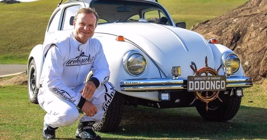 Rubens Barrichello dirige réplica do fusca de Jesse e Shurastey em homenagem à dupla