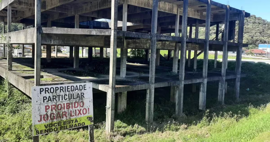Um projeto abandonado, de quase 30 anos, marca a vista de quem entra em Brusque pela rodovia Antônio Heil e gera curiosidade nos moradores. A construção parada há muito tempo e tomada pela vegetação foi alvo de disputas judiciais que, depois de mais de 20 anos, se aproximam do fim.