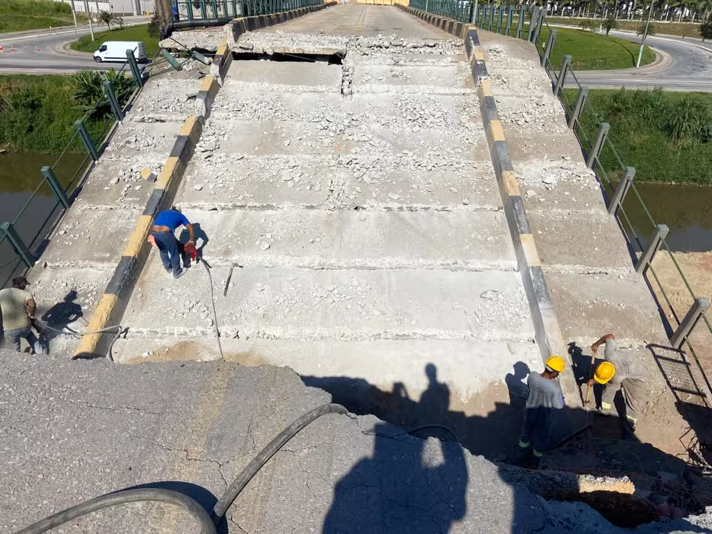 A reportagem de O Município esteve no local da obra no início da tarde desta segunda-feira, 3. Seis operários trabalhavam no local usando rompedores pneumáticos para quebrar o concreto da cabeceira.