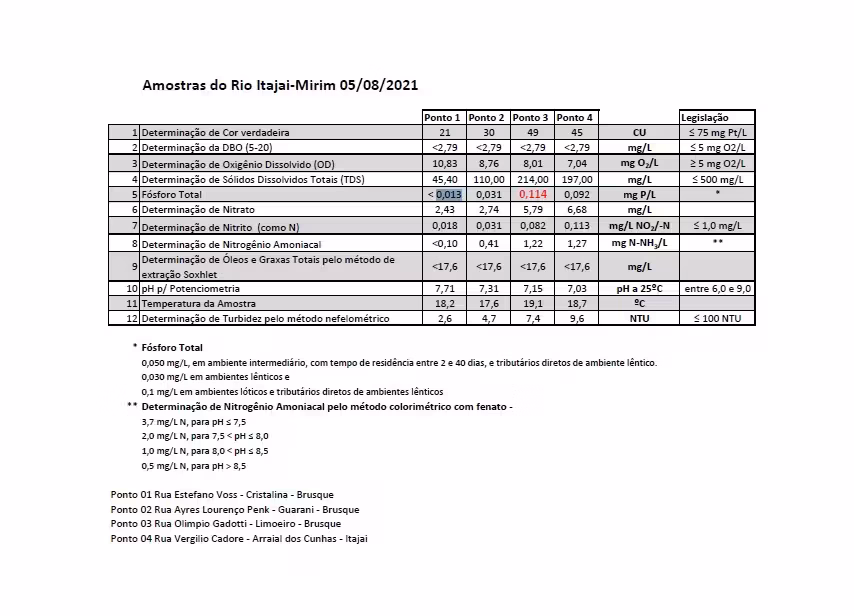 Luciano conta que o resultado era esperado, pelo esgoto sanitário. “Sendo que em Itajaí é 0,092mg/L, ainda mais baixo. Isso se explica pelo tempo de depuração que tem a nossa água até chegar na coleta de Itajaí. Fora isso, todas as outras as caracterizações foram praticamente muito próximas e dentro do que permite a resolução do Conama”, explica.