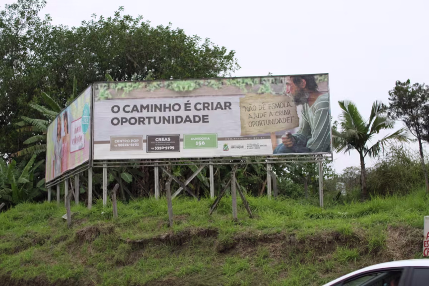 Na última semana, a Prefeitura de Brusque iniciou a segunda etapa de sua campanha contra a doação de esmolas nos semáforos. A iniciativa "Não dê esmola, ajude a criar oportunidade" começou com a instalação de mais de 40 placas pelas ruas e, neste segundo momento, foram colocados cinco outdoors em pontos da cidade.