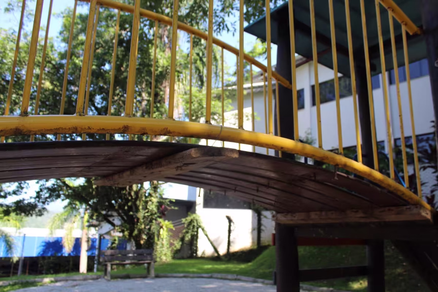 Já o parquinho próximo ao reservatório R5 do Serviço Autônomo Municipal de Água e Esgoto (Samae) está com a estrutura de ferro enferrujada e quebrada, e parte da madeira utilizada no chão do brinquedo não existe mais, deixando grandes vãos na passagem.