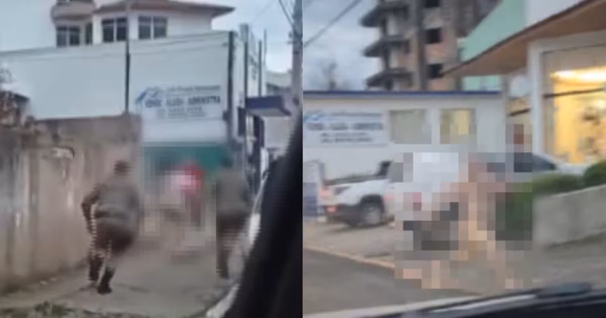 Após alguns minutos, a Polícia Militar chegou no local para abordá-lo. Durante a tentativa de parar o homem, ele tenta fugir dos policiais e sai correndo para outro lado da rua.