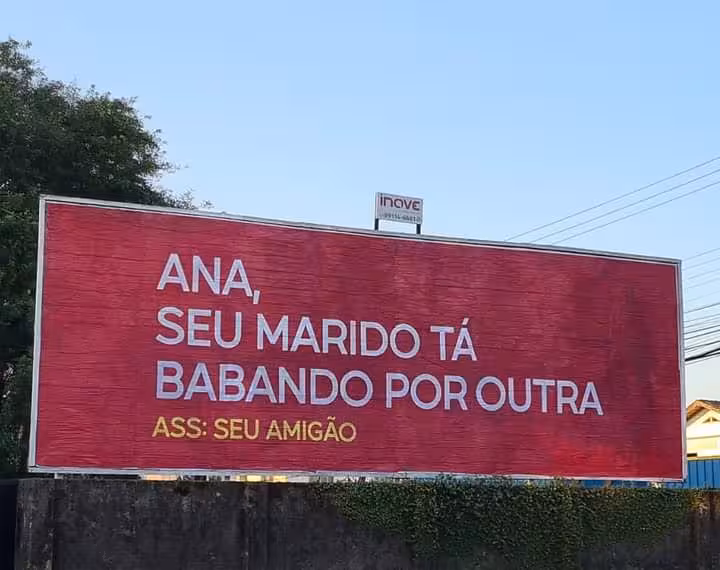 Um outdoor exposto no Centro de Brusque tem chamado a atenção nesta segunda-feira, 4. O espaço, localizado na esquina entre a rua Do Centenário e a avenida Otto Renaux, traz um recado direcionado para uma pessoa chamada Ana ter mais atenção com o marido.