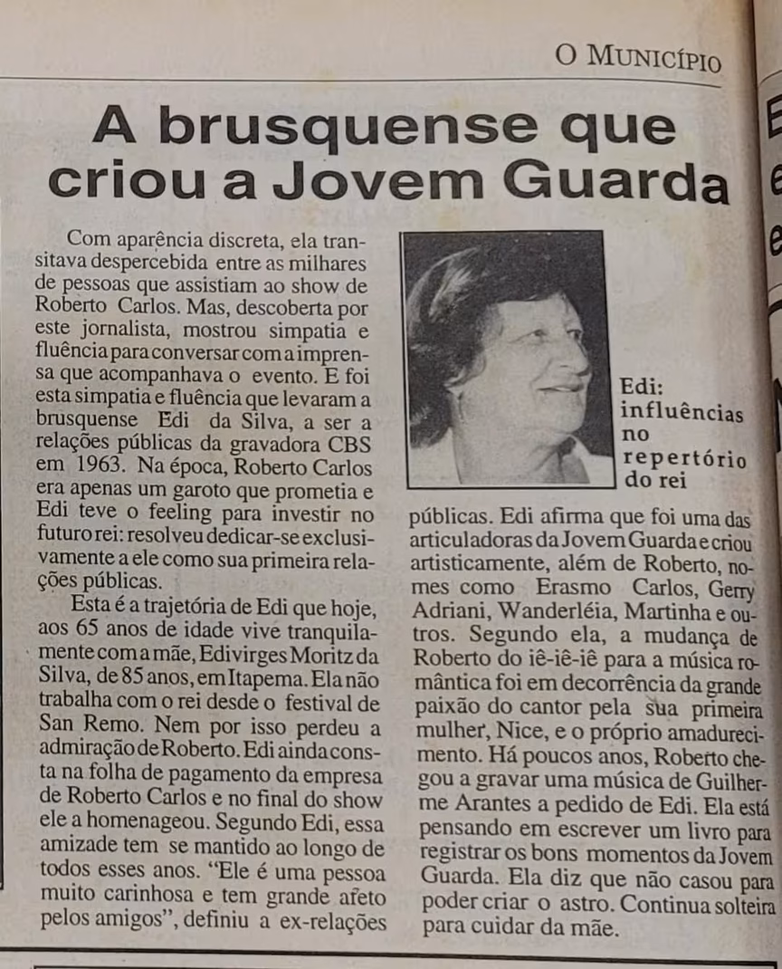 “Roberto Carlos era apenas um garoto que prometia e Edi teve o ‘feeling’ (sentiu) para investir no futuro rei: resolveu dedicar-se exclusivamente a ele como sua primeira relações públicas”, consta na edição da época.