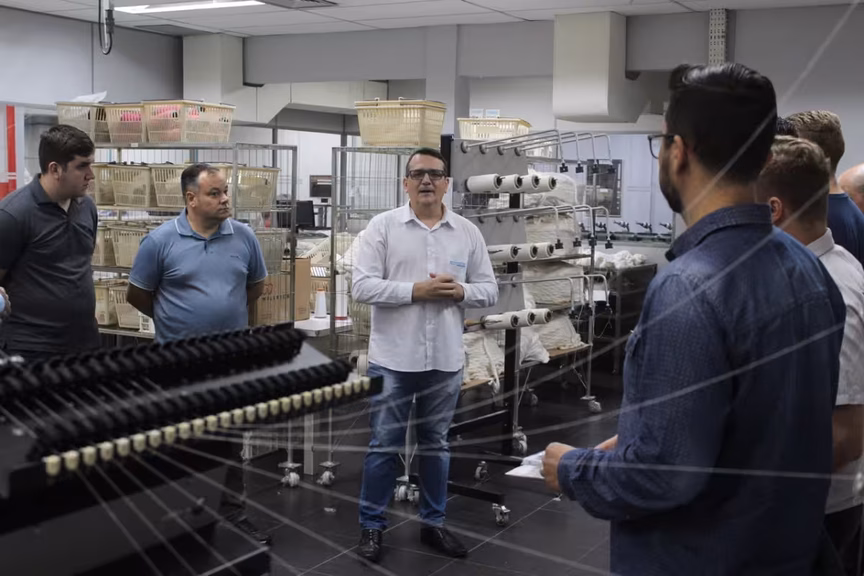 Na sequência foi feita a visita no instituto têxtil, onde foram apresentados ensaios de fibras de algodão, fios e também costurabilidade UV. Depois, a programação seguiu para uma visita na Karsten.