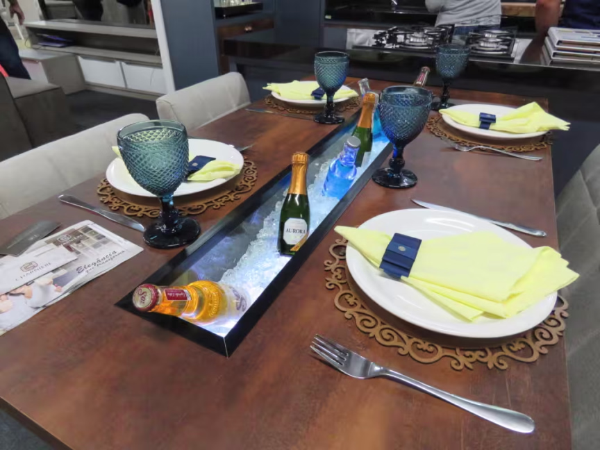 A cozinha interativa também atraiu os olhares, até porque uma mesa com um espaço ao meio para depositar gelo e bebidas nunca havia sido produzida antes na região. O proprietário da Charniere, Fabio Gripa, conta que teve a ideia de criar o móvel durante um encontro entre amigos.