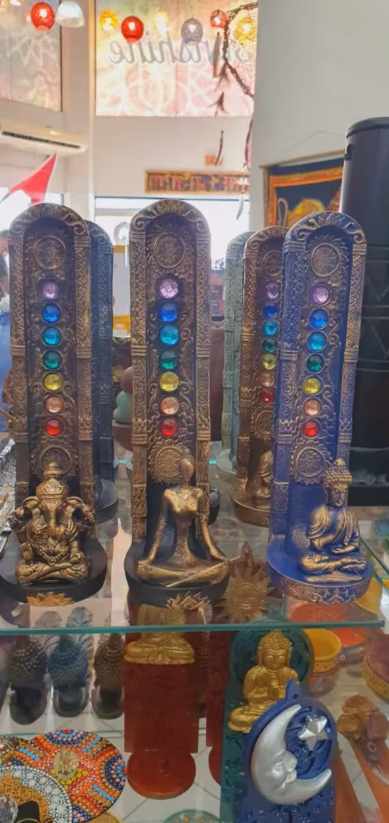 Para adquirir ou presentear, a loja possui diversas opções de porta-incensos diferenciados, inclusive algumas peças mais difíceis de encontrar. Aromatizadores de ambientes com vários tipos de óleos naturais também são vendidos. No local, há uma grande diversidade de imagens budistas, católicas, xamânicas e umbandistas. Além disso, também é possível adquirir decorações, como fontes artesanais, que estão disponíveis em diversos tamanhos. Além dos cristais em unidades, o estabelecimento também vende drusas de ametistas, originárias do Rio Grande do Sul, em vários tamanhos.