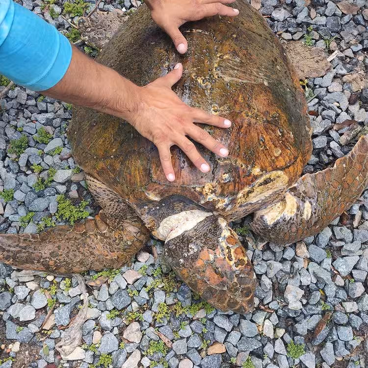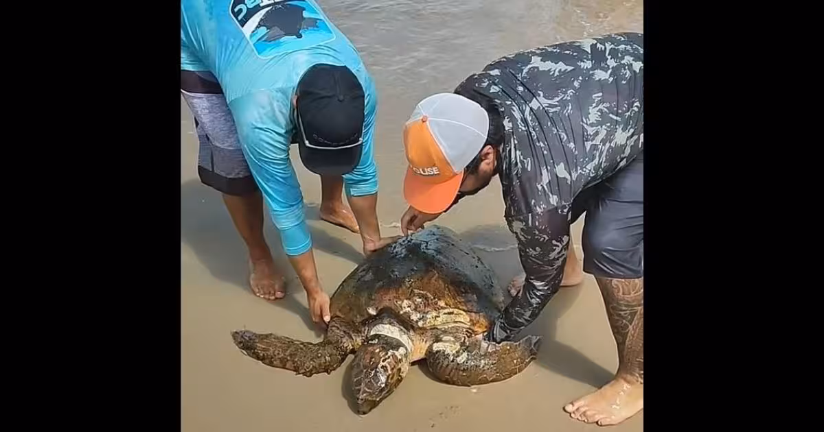 Segundo o grupo, o pessoal que retirou ela do mar relatou que navegavam pelo local quando a encontraram se batendo no mar. A tartaruga marinha estava enroscada e presa em resíduos descartado no mar, como cordas e madeiras. Confira vídeo abaixo: