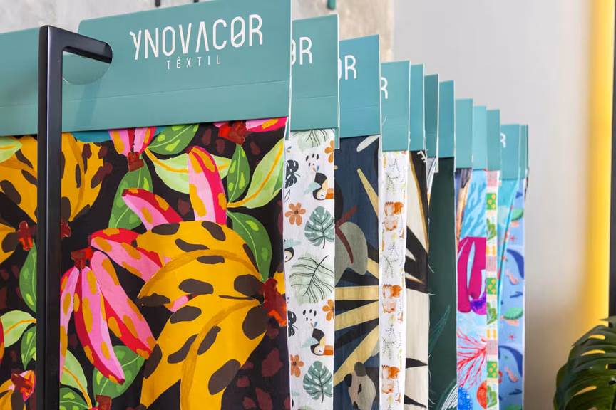 A Ynovacor é especializada em estampar malhas e tecidos em fibras como algodão e viscose, com foco em bases como suedine, cotton, meia malha, além de tecidos planos como sarja e brim.