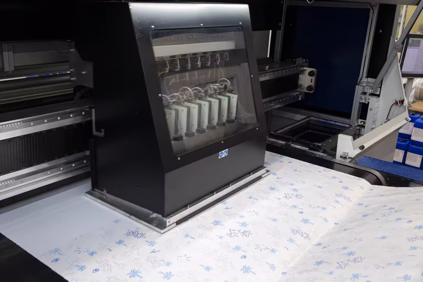 Além da eficiência ambiental, a nova tecnologia encurta prazos: os ciclos de produção e desenvolvimento de mostruários são até 50% mais rápidos que na estamparia rotativa convencional.