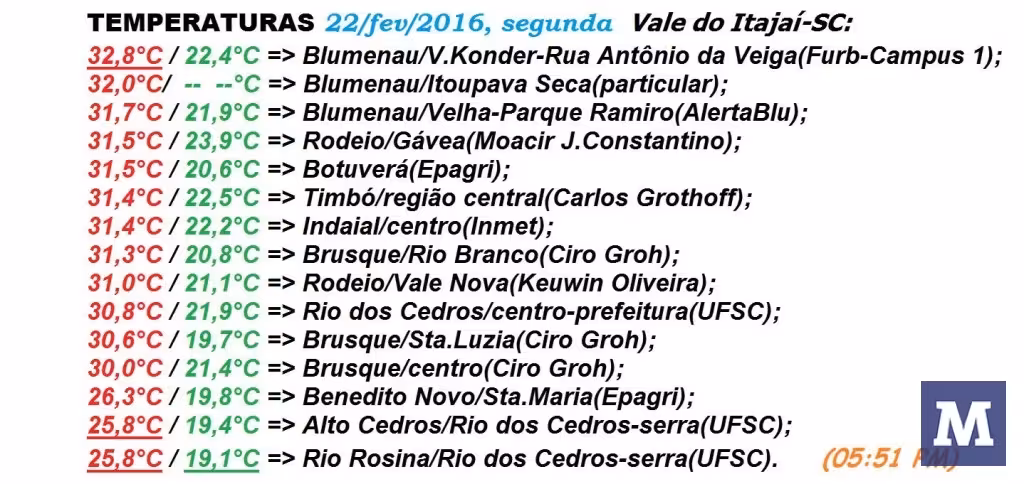 Segue em anexo, ilustrando o Post, a relação das temperaturas extremas ocorridas no dia de hoje (22) na região do Vale do Itajaí-SC. Blumenau-SC liderou a relação, nas três primeiras colocações, sendo estas informações fornecidas pelo amigo Carlos Grothoff, de Timbó-SC.