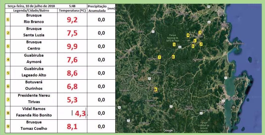 Na região, Vidal Ramos ficou com o valor mais baixo no Vale do Itajaí Mirim, 4,3 ºC seguido de Presidente Nereu com 5,3 ºC. Acompanhe abaixo as informações completas das mínimas de hoje, registrado por minha rede de estações, nos respectivos locais descritos em anexo: