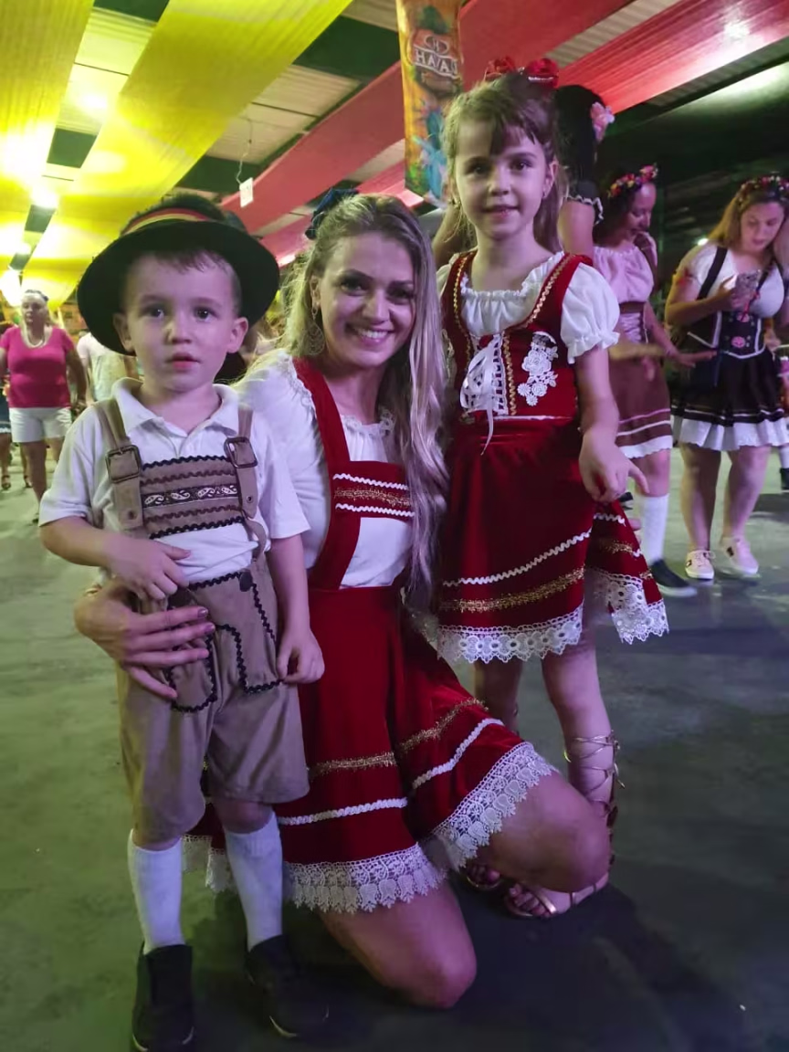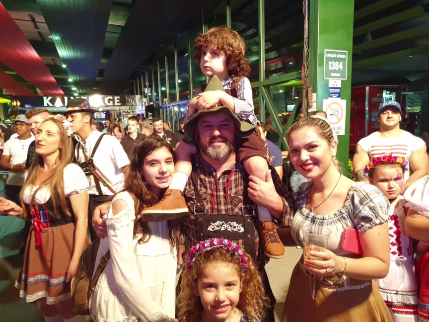 Já a família Mafra, vindos de Itajaí, compareceu em peso na festa. Samanta e Fábio, também trouxeram seus filhos, José de quatro, Laura de seis e, Maria Clara com doze anos para a Fenarreco. Também com trajes alemães, curtiram todos as músicas da Banda D’Fiedes que se apresentou no palco cultural entre 21h e 23h30min. “Minha filha Laura, fala alemão, é youtuber e tem grande conhecimento da cultura germânica. Estamos sempre na Fenarreco porque ela resgata a cultura e é um ambiente familiar”, comenta Samanta.
