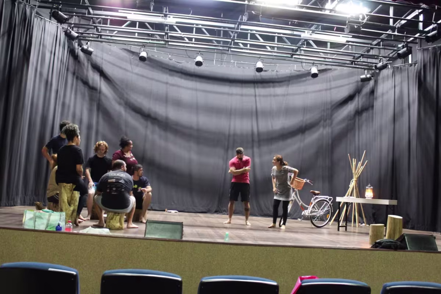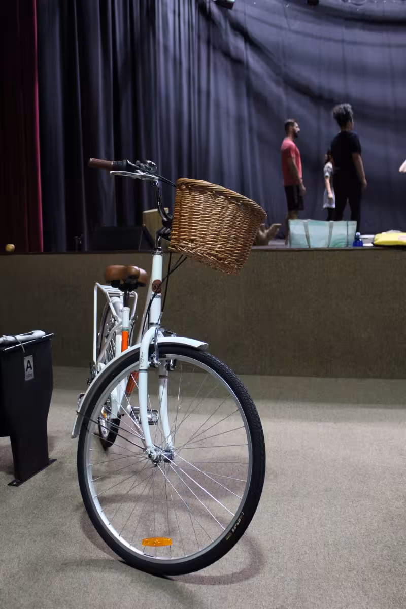 Para o ensaio, os atores organizam no palco tocos de madeira que são utilizados como bancos e também há uma espécie de "oca" feita com bambus, o que remete à origem indígena da personagem. A bicicleta é utilizada por Talita, que interpreta Fanny.