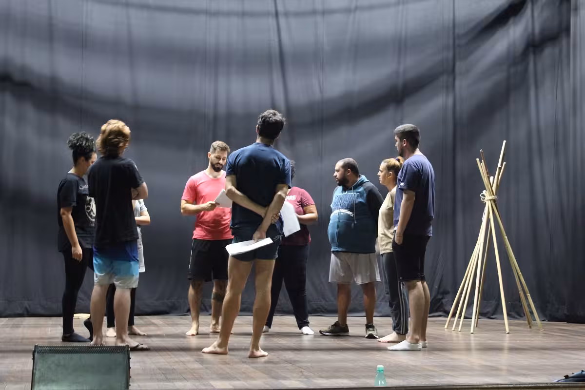 O relógio marca 8h30 de sábado, 16, quando os primeiros atores do Trama Grupo de Teatro chegam ao Centro Empresarial, Social e Cultural de Brusque (Cescb) para ensaiar. O espetáculo “Fanny, a rainha da cidade” estreia no dia 23 de março e cada minuto conta. Os nove atores sobem ao palco e fazem um aquecimento com caminhadas, corridas e explosões de energia para entrarem no personagem.