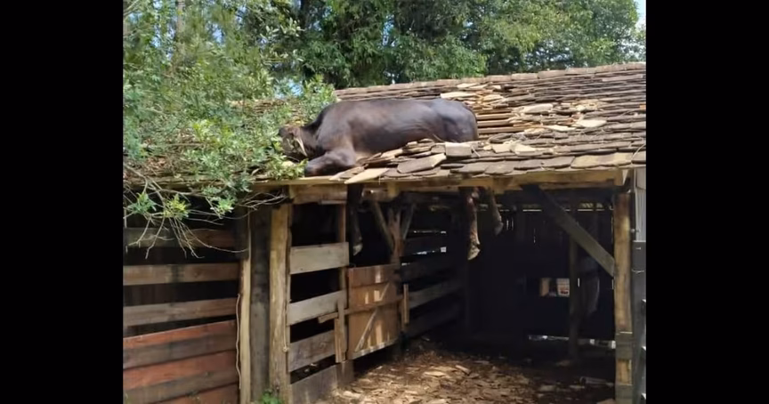 Uma vaca precisou ser atendida pelo Corpo de Bombeiros de Timbó no fim da manhã deste domingo, em Timbó. Eram por volta das 11h30 quando os socorristas foram acionados, pois o animal estava em cima do telhado de um rancho, localizado na Estrada Geral, no bairro Mulde.