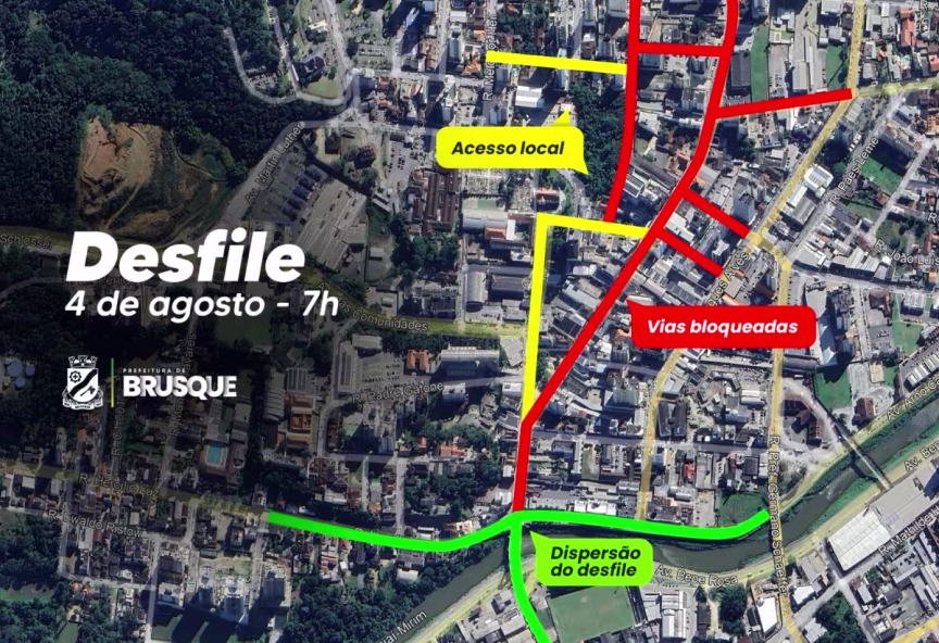 A Prefeitura de Brusque, por meio da Diretoria de Trânsito, comunica que, devido ao desfile em comemoração ao aniversário dos 163 anos de Brusque, haverá alterações na circulação viária da área central. O desfile, marcado para sexta-feira, 4, às 9h, com fechamento das vias que servirão para a concentração e desfile a partir das 7h.
