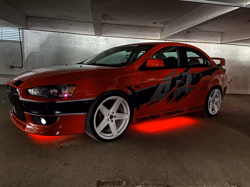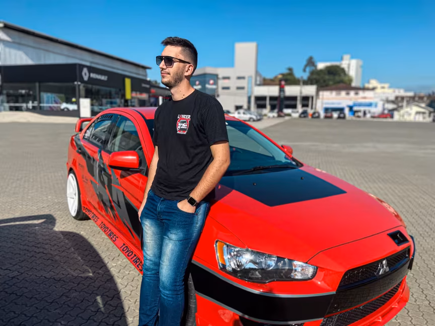 "O meu carro antes era prata, porém, queríamos deixar ele mais diferenciado. Quando fui em um evento automotivo, 'vimos alguns Lancer' em cores exóticas. Naquele momento decidi envelopar ele de azul, porém, por ser fã dos filmes, decidi que faria o carro vermelho (do terceiro filme)", conta.