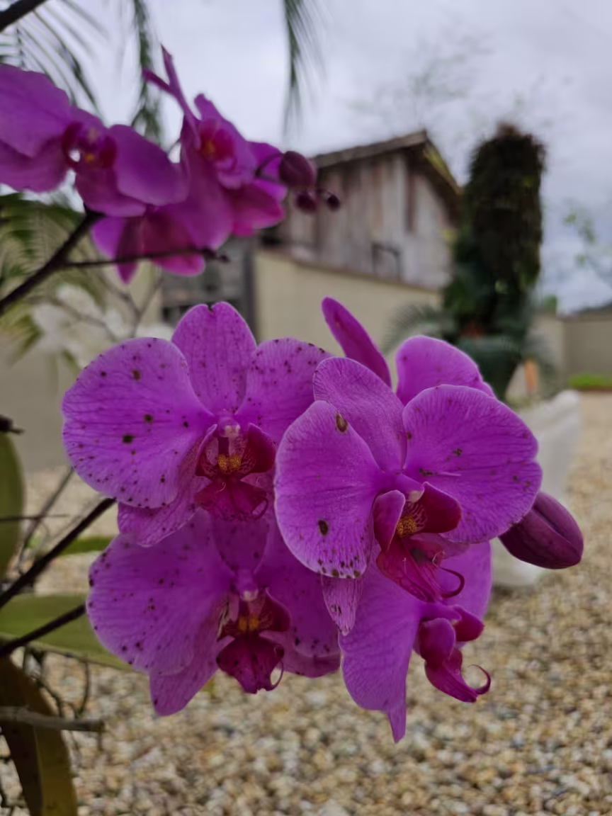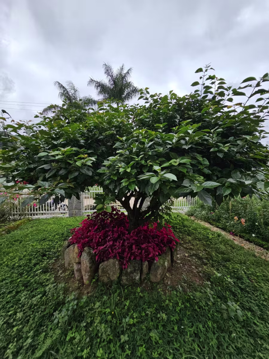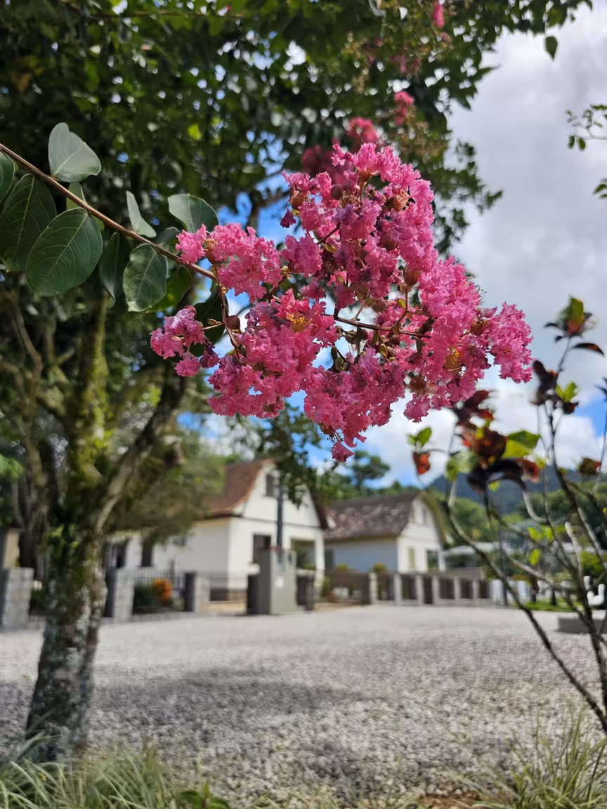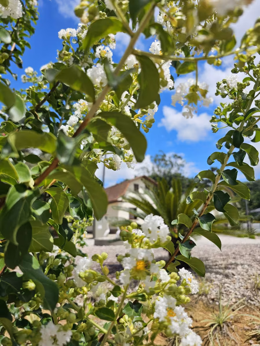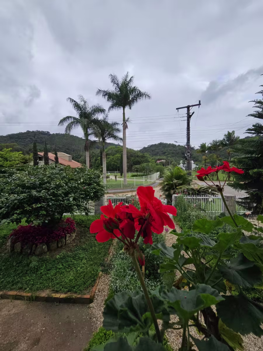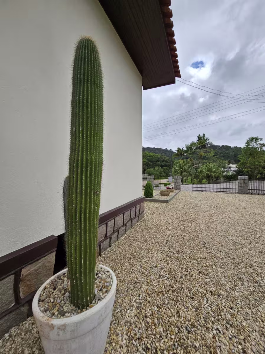 As casas gêmeas em Guabiruba não se destacam apenas pelo seu excepcional projeto arquitetônico; são também cercadas por quintais repletos de hortaliças, plantas e flores de diversas espécies e cores.