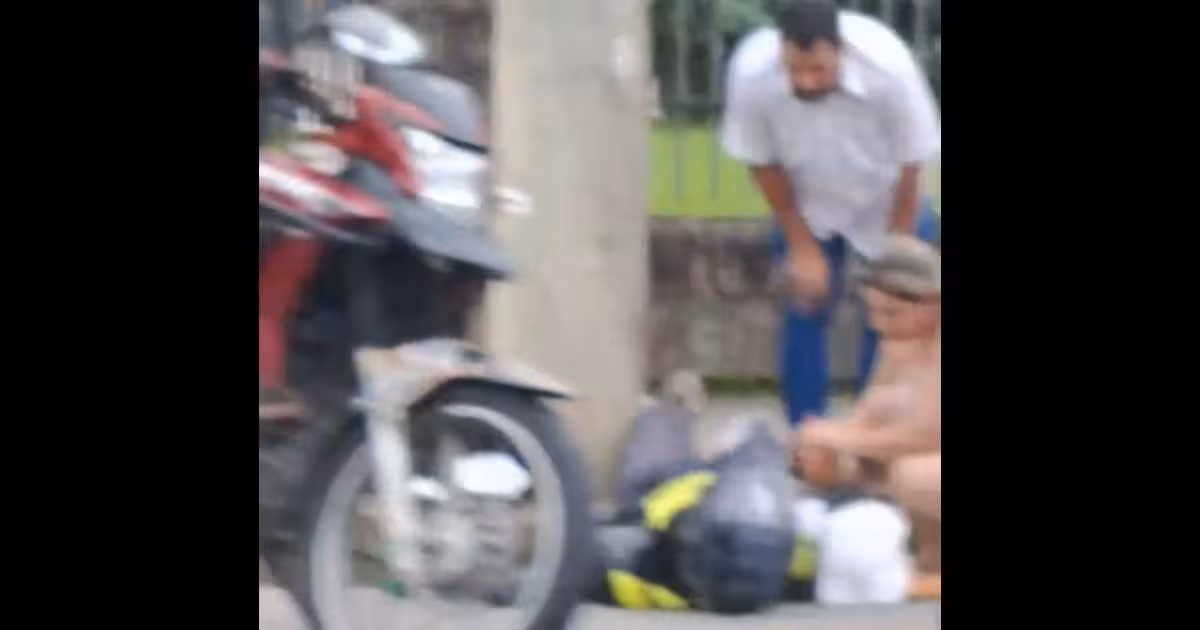 Pelo vídeo gravado pela testemunha é possível ver o motociclista deitado no chão recebendo ajuda de outras pessoas.