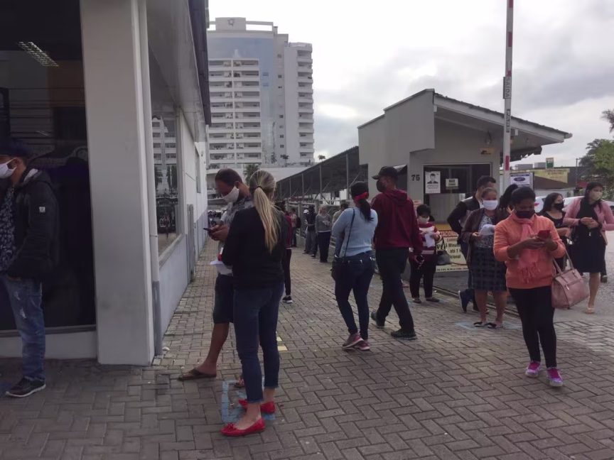 Uma fila com centenas de pessoas se formou em frente da agência da Caixa Econômica Federal no Centro de Brusque, a maioria delas buscando sacar o auxílio emergencial de R$ 600 mensais proposto pelo Congresso Nacional em meio à pandemia de Covid-19. Cenas do tipo têm se tornado comuns em diversas cidades.