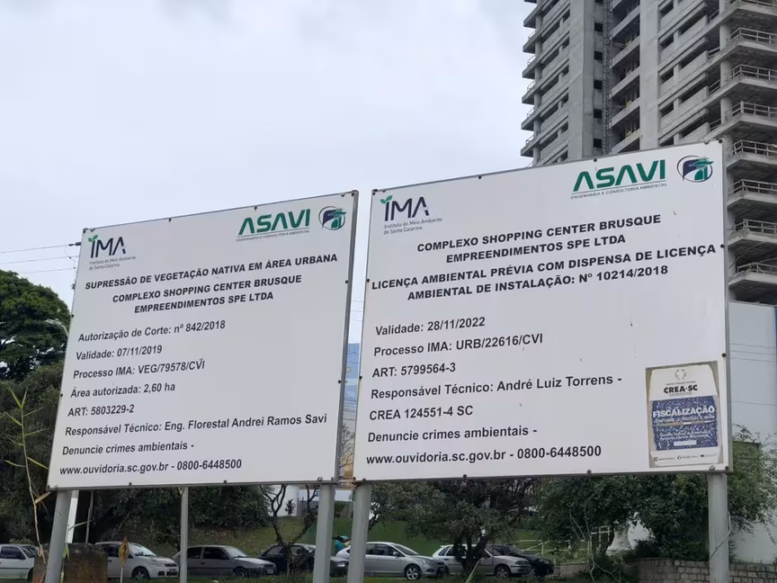 As placas com as licenças ambientais do Instituto do Meio Ambiente de Santa Catarina (IMA) para construção da estrutura ainda seguem instaladas no local. O empreendimento é da empresa paulistana Sacs Consult e está em pauta desde 2015.